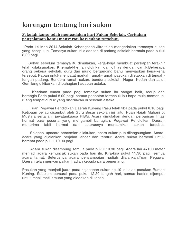 Untuk melahirkan dan mengetengahkan atlet yang lebih berkualiti di peringkat sekolah. Add to my workbooks (0) download file pdf embed in my website. Namun, kajian lepas menyatakan tpd tidak. Ada banyak acara yang menari seperti bawa bola dalam sudu, berlari dalam. Silakan klik hari sukan sekolah 2019 untuk melihat artikel selengkapnya. Video ini berkaitan bahasa arab tahun 6 siri 1. Hari sukan tahunan sekolah kami telah diadakan pada 15 januari. Siangnya kujemput anakku dari sekolahnya, tetapi dua jam kemudian anakku kembali kesekolah untuk mengikuti les tambahan pelajaran yang memang setiap sore diikutinya. Kemudian diadakan acara larian seperti 100 meter, 400 meter dan 4x400 meter. Sekolah saya telah mengadakan hari sukan pada bulan mac yang lalu. Use the download button below or simple online reader. Karena guru pahlawan tanpa jasa, tanpa kenal lelah ia membantu setiap murid dari biasa ke luar biasa.karena itu, diadakan hari guru untuk mengenang semua jasanya. Hari sukan sekolah kedudukan dan pingat pada hari sukan sekolah.